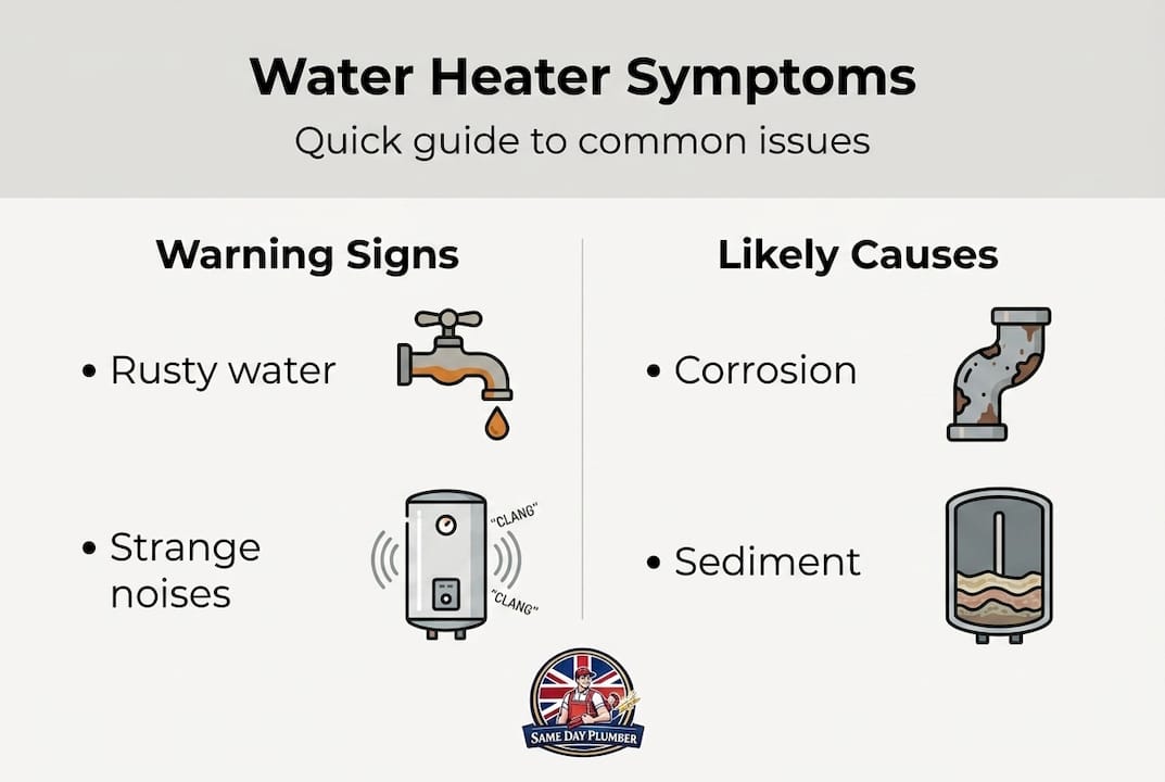 - Rust-coloured water often signals tank corrosion or a failing anode rod, not always the pipework