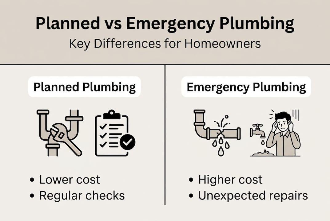 Planned plumbing involves preventive maintenance, inspections, and upgrades designed to keep your system reliable and compliant with current standards. It is the difference between a plumber visiting your home on your terms versus scrambling to find someone available at 11pm on a bank holiday.